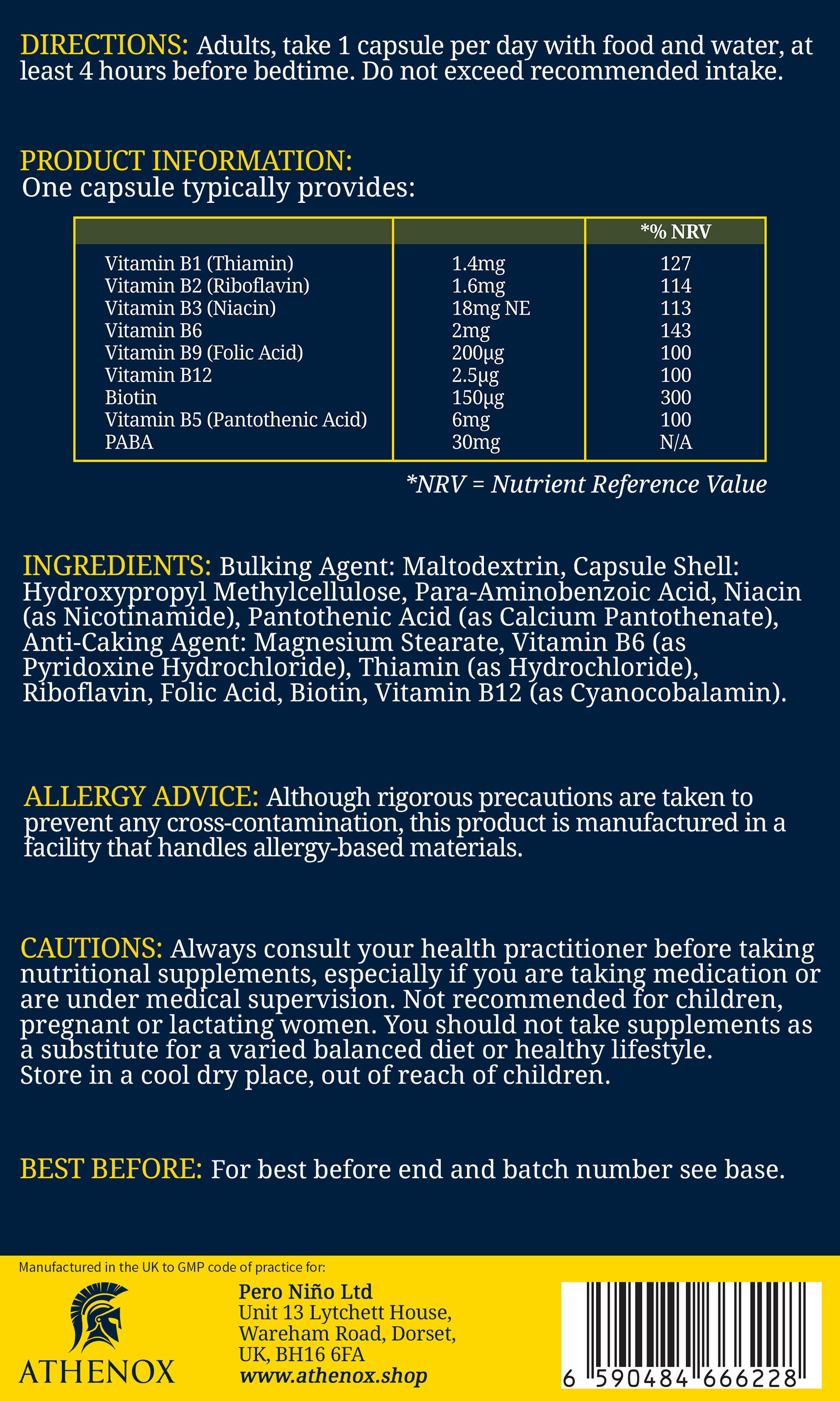 Why Choose ATHENOX: ATHENOX is dedicated to providing high-quality supplements formulated with the finest ingredients. Our Daily Vitality B-Complex is crafted to offer you comprehensive support for your energy levels, brain function, and overall health.