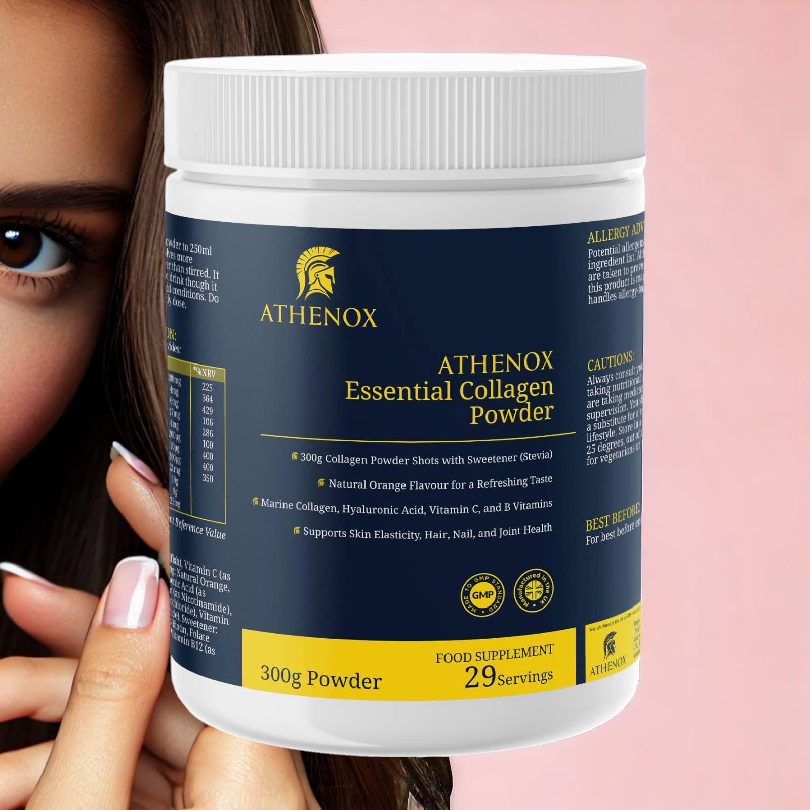 Experience the rejuvenating benefits of ATHENOX Essential Collagen Powder. Our premium blend combines Marine Collagen, Hyaluronic Acid, Vitamin C, and B Vitamins to support your skin elasticity, hair, nail, and joint health. With a delightful natural orange flavour and sweetened with Stevia, it’s the perfect addition to your daily wellness routine.