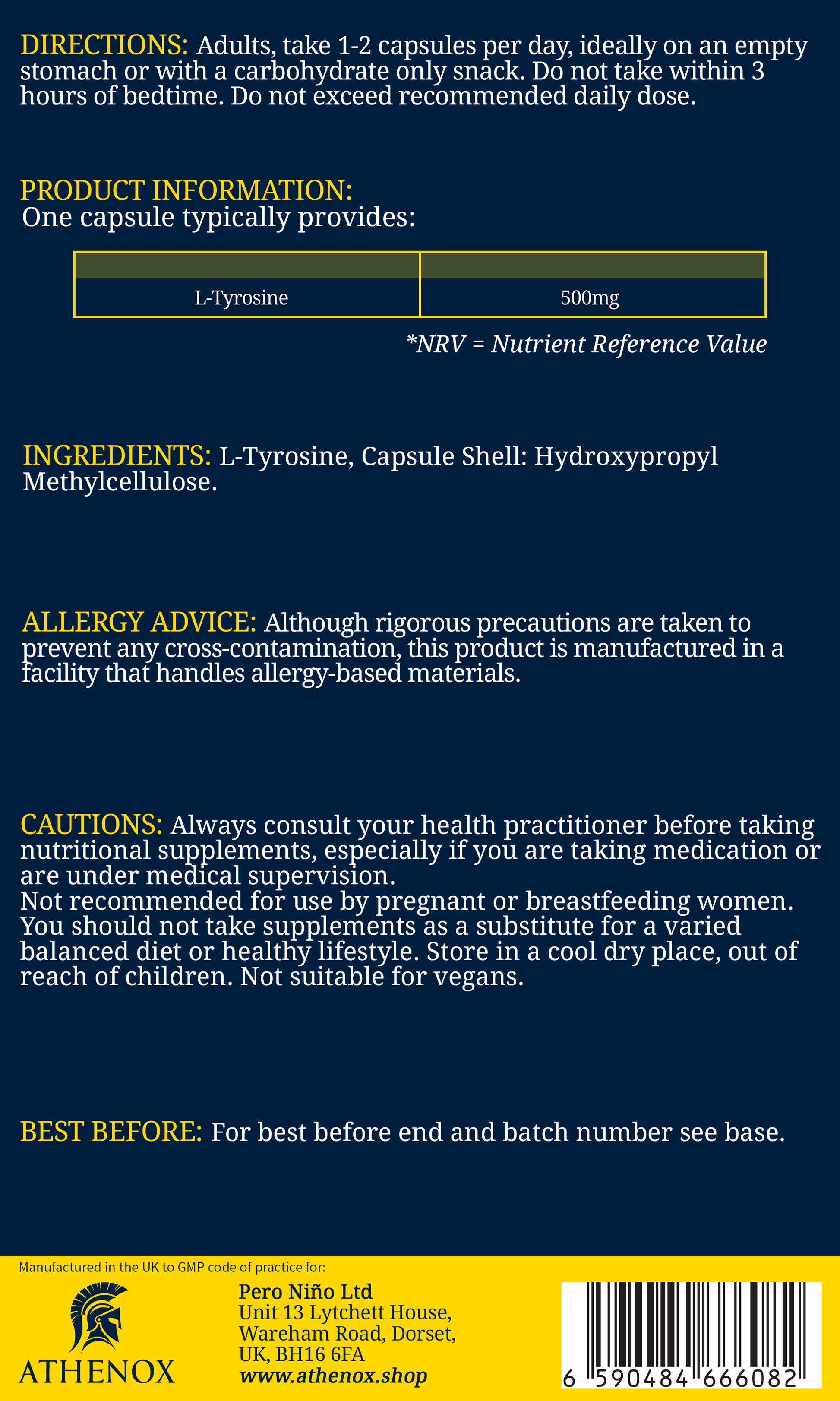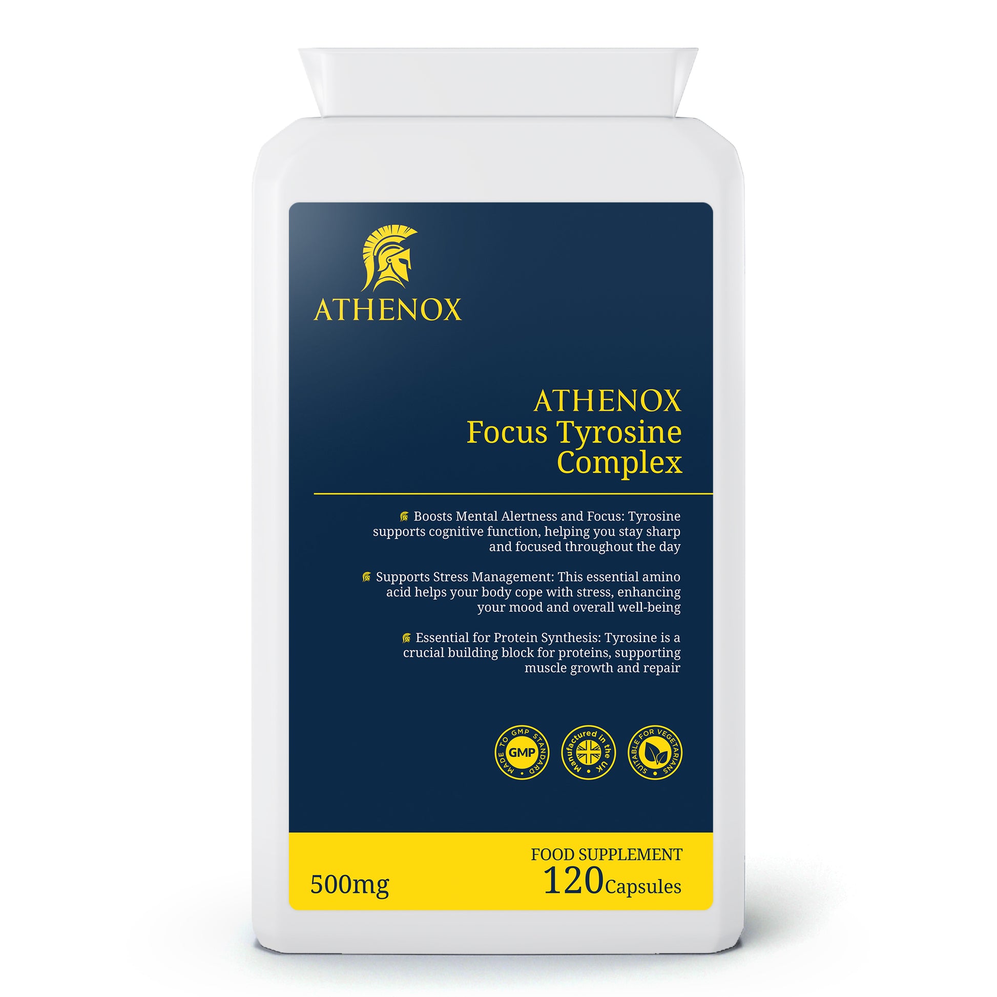 Unlock your mental potential with ATHENOX Focus Tyrosine Complex. This high-potency supplement features 500mg of L-Tyrosine per capsule, an essential amino acid known for its role in cognitive function and mood enhancement. L-Tyrosine supports neurotransmitter production, helping to improve focus, reduce stress, and enhance overall well-being. Ideal for those seeking to boost their mental clarity and manage stress, ATHENOX Focus Tyrosine Complex is your go-to supplement for optimal brain health.